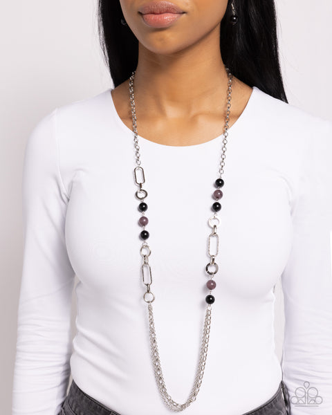 A collection of glassy and polished black beads give way to layers of mismatched silver chain for a whimsical look. Features an adjustable clasp closure.