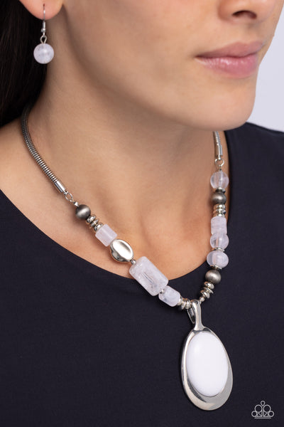 Giving way from a silver snake chain, a collection of glassy milky white beads, silver accents, and silver-patterned beads are threaded along an invisible wire below the collar for a flamboyant fashion. Pressed in a silver oval frame, an opaque white acrylic gleams below the capricious display for an additional pop of color. Features an adjustable clasp closure.