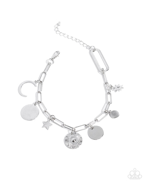 Gliding along a silver paperclip chain, a collection of aesthetic astral charms including a silver star, a three-dimensional silver star, silver discs of varying sizes, a silver sunburst pendant, and a silver crescent moon sway along the wrist. Features an adjustable clasp closure.
