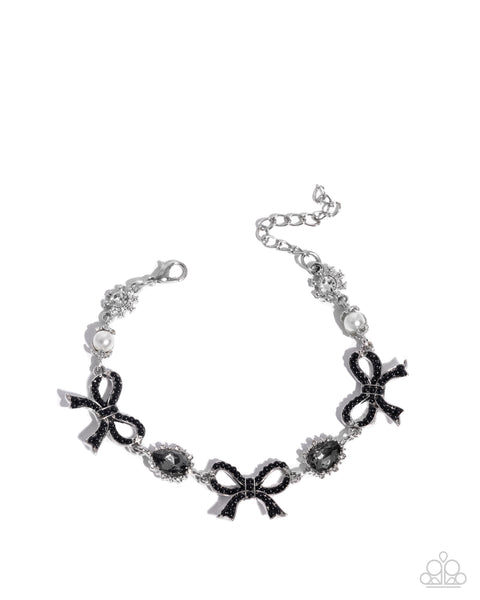 Dainty black beads line the frames of a trio of silver bow charms, alternating along the wrist with smoky teardrops bordered with dainty white rhinestones. Two polished pearls with capped silver beads join white rhinestones nestled inside studded silver frames on each end, adding a playful twist to the whimsical design. Features an adjustable clasp closure. Order Date: April 17, 2025