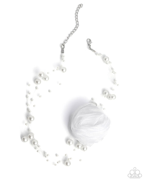 Infused along copious, dainty invisible wires, an exaggerated display of white pearls in varying sizes elegantly sweeps below the collar. A sparkly white tulle rose blooms along the center of the regal piece, adding over-the-top whimsicality to the unapologetic pearl palette. Features an adjustable clasp closure. Order Date: March 11, 2025