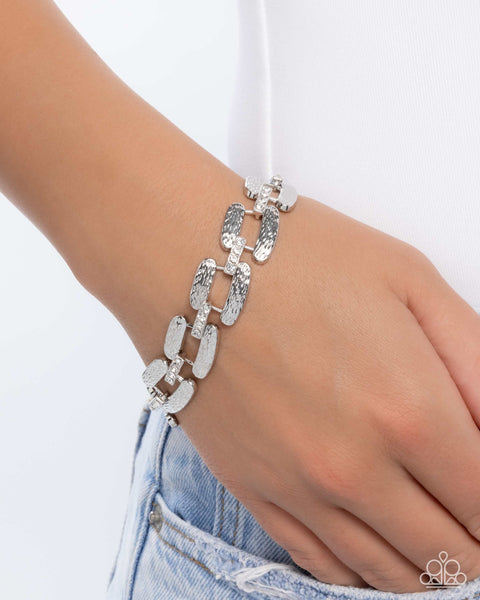 Bold, split, hammered silver links are held together along the wrist by white rhinestone-encrusted silver bars for a freestylish fierce look. Features an adjustable clasp closure. Order Date: 4/16/25