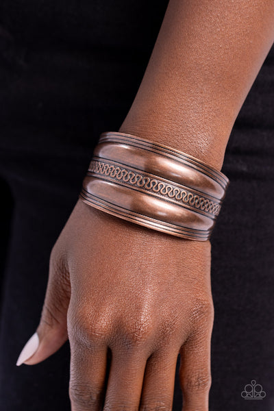 A rustic serpentine pattern is embossed across the center of a thick beveled copper cuff that is bordered in linear patterns, creating a bold metallic centerpiece around the wrist. Order Date: 1/14/25