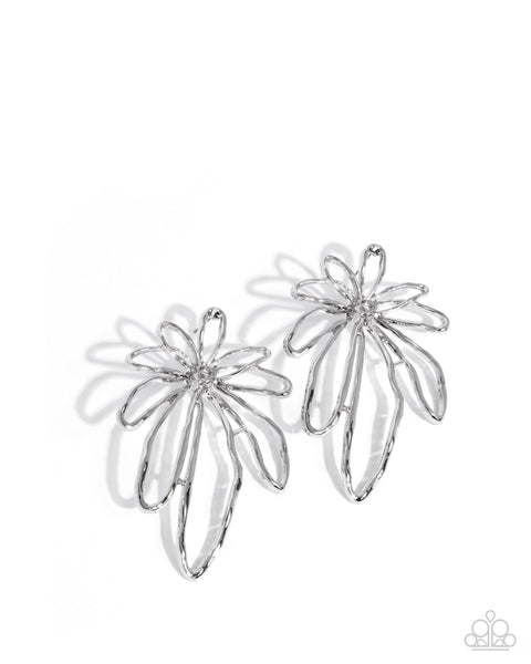 Intricate wires with a silver finish are shaped like petals and knotted in the center to create a delicate silhouette of a daisy, elongating below the ear for a wildly whimsical centerpiece. Earring attaches to a standard post fitting. Order Date: March 3, 2025.