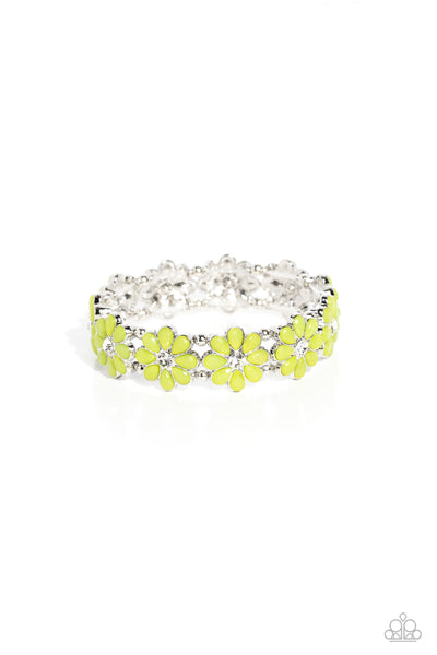 A collection of Love Bird petals blooms from the center of a white crystal-like gem, creating a sparkling floral arrangement across the wrist. Separating each flower, silver beads are added along elastic bands for a high-sheen finish. (911)