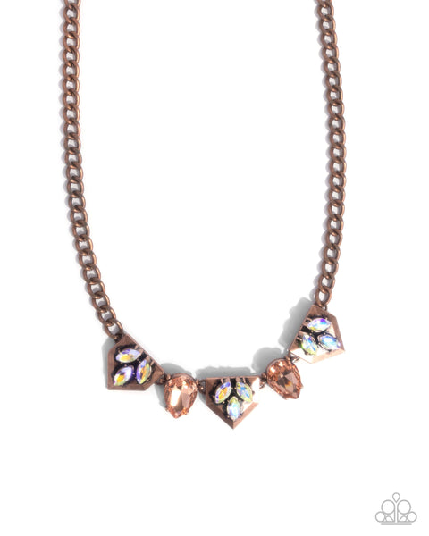 Featuring a chunky copper curb chain, a trio of geometric pendants and oversized peach gem teardrops rest below the neckline. Each copper triangle showcases clusters of marquise-cut iridescent rhinestones that create a striking contrast against the metal. Features an adjustable clasp closure.