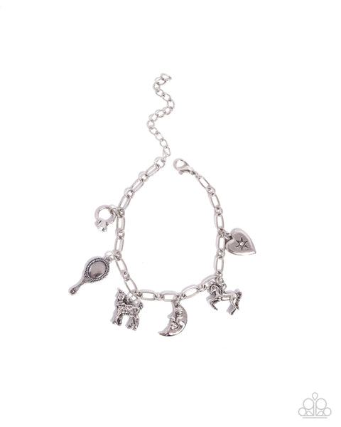 Inspired by the nursery rhyme "Hush Little Baby" a collection of glistening silver charms including a white rhinestone ring, a looking glass, a billy goat, a crescent moon, a horse, and a heart swing along a silver paperclip chain along the wrist for a nostalgically pretty display. Features an adjustable clasp closure. Order Date: April 24, 2025