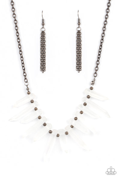 Separated by dainty gunmetal beads, an opaque collection of glassy-like icicle beads fans out below the collar, creating an icy fringe. Features an adjustable clasp closure. (541)