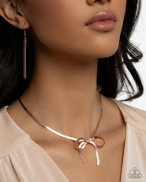 A strand of shiny copper boston link chain loops and curls into a delicate bow below the neckline for a fashionably feminine display. Features an adjustable clasp closure. Order Date: January 21, 2025
