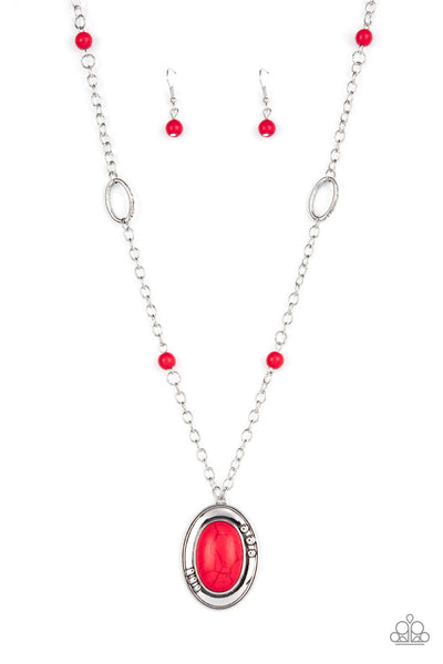 An oval red stone is pressed into the center of a studded silver frame at the bottom of a red stone and textured oval dotted silver chain, resulting in a colorful artisan inspired pendant below the collar. Features an adjustable clasp closure. (643)
