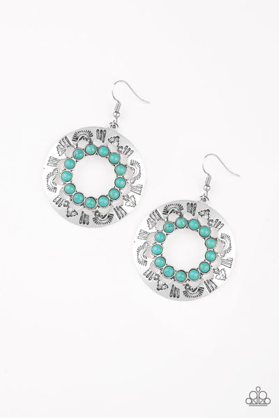 Refreshing turquoise stones spin around the center of a shimmery silver hoop stamped in tribal inspired patterns for a seasonal look. Earring attaches to a standard fishhook fitting.