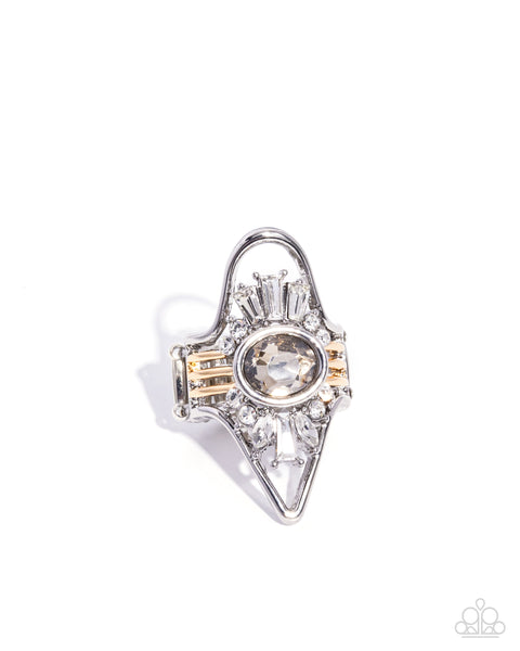 Featuring an smoky oval gem in its center, a sleek elongated silver frame sits atop the finger for a sophisticated design. A geometric array of white rhinestones stacks above and below the smoky oval gem while trios of golden bands flare out from each side, adding a metallic warmth to the design. Features a stretchy band for a flexible fit. Order Date: April 11, 2025