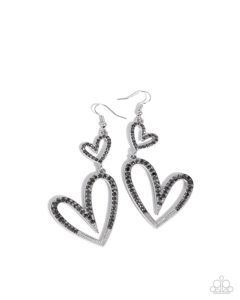 An oversized, hematite rhinestone-encrusted shiny silver heart silhouette hangs from a smaller heart silhouette set in the same blinding shimmer for a romantic, eye-catching sparkle. Earring attaches to a standard fishhook fitting. Order Date: March 2, 2025.