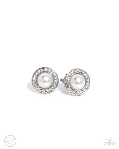 Pressed in a thick silver border of white rhinestones, a glistening half-white pearl stands out for a cultured cuff link. Order Date: February 27, 2025