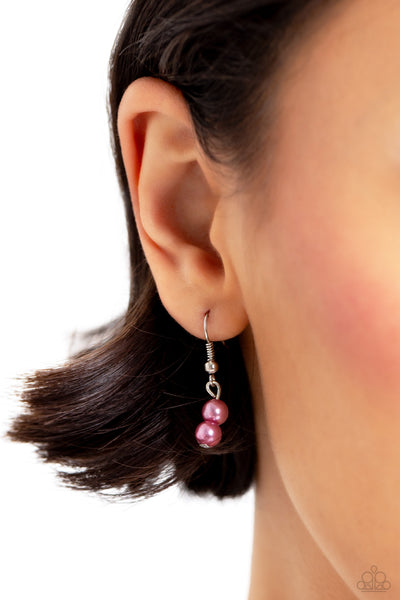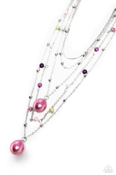 Dainty multicolored pearls and silver beads trickle along an assortment of silver chains, creating shimmery layers across the chest. Two exaggerated light orchid pearly teardrops cascade from the bottom of the design for additional eye-catching detail. Features an adjustable clasp closure. (813) Order Date 10/25/23