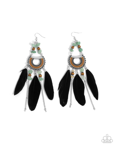 Embellished below the ear, stacks of jade stones, silver wheel beads, and brown wooden beads give way to a decorative silver-studded frame featuring a pop of Buckthorn Brown paint for an over-the-top earthy lure. Black feathers and additional jade and transparent stones, silver wheel beads, and brown wooden beads are infused along classic silver chain strands, creating a dramatic, uneven fringed finish. Earring attaches to a standard fishhook fitting. As the stone elements in this piece are natural, some color variation is normal. Order Date: April 24, 2025