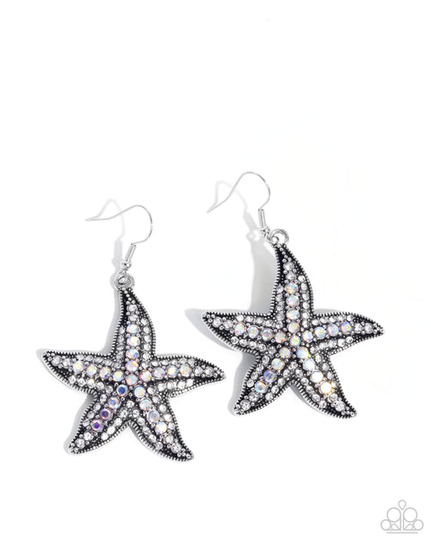 Shimmering with iridescent and white rhinestones, the silver starfish frames exude coastal charm. The textured silver finish and sparkling rhinestone accents create a dazzling seaside-inspired look. Earring attaches to a standard fishhook fitting. Order Date: March 29, 2025