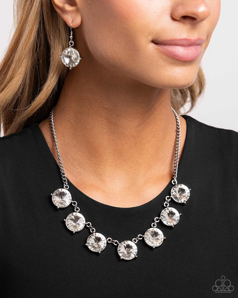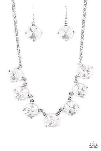 Attached to glistening silver chains, a dramatic collection of oversized white rhinestones boldly links into a smoldering statement piece below the collar. Features an adjustable clasp closure.