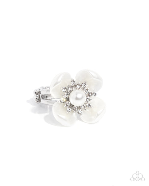 Featuring a snowflake-like motif, glistening white rhinestones explode around a glossy white pearl for a luminescent look. White pearl petals curl around the polished posh centerpiece for a whimsical centerpiece atop airy silver bands. Features a dainty stretchy band for a flexible fit. Order Date: 11/29/24