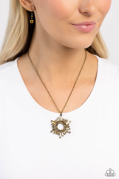 A border of aurum rhinestones is pressed into the center of an aurum emerald-cut gem brass sunburst frame for a mystically edgy finish. Each ray features a varied size and hue for additional eye-catching detail. Features an adjustable clasp closure. (779)
