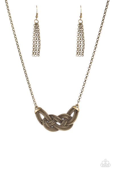 Featuring chain-like patterns, antiqued brass bars knot below the collar for a bold industrial look. Features an adjustable clasp closure. (495)
