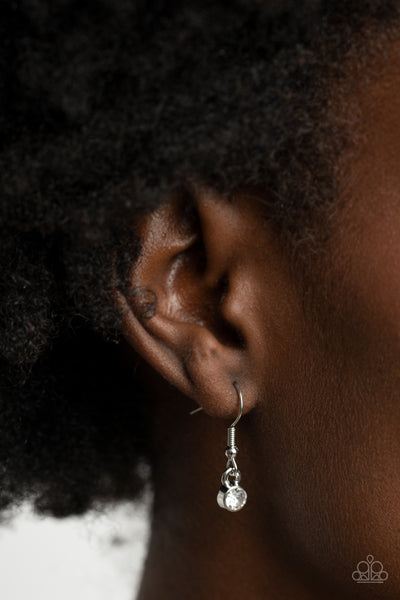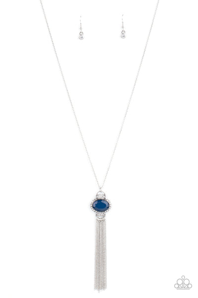 Bordered in glassy white rhinestones, a faceted blue bead dotted frame gives way to a curtain of shimmery silver chains, creating a glamorous pendant. Features an adjustable clasp closure. (493)