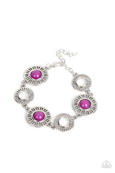 Airy silver frames radiate around open centers while larger silver frames feature linear cutouts with milky bead centers in the Pantone® of Dahlia. The cheerful designs link together around the wrist creating a whimsically industrial vibe. Features an adjustable clasp closure. (743)