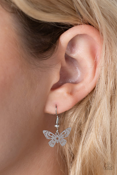 Layered with ornate silver wings, an iridescent pink rhinestone dotted butterfly flutters from a dainty silver chain below the collar for a whimsical fashion. Features an adjustable clasp closure. (95)