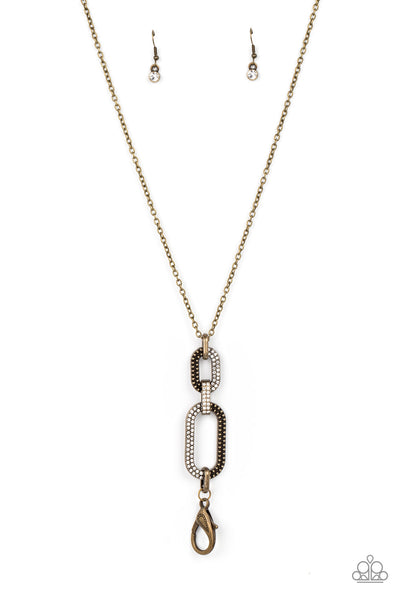 Featuring half studs and half white rhinestones, two sparkly brass oval frames link with rustic brass fittings at the bottom of a lengthened brass chain for a gritty-glamorous look. A lobster clasp hangs from the bottom of the design to allow a name badge or other item to be attached. Features an adjustable clasp closure. (689)