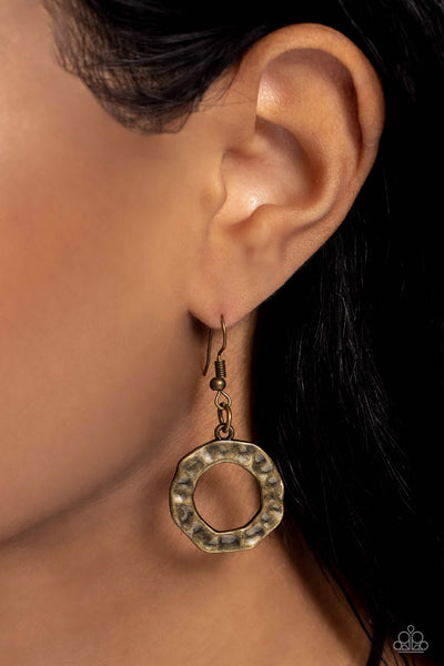 Featuring an antiqued finish, a hammered collection of brass hoops coalesces down the neckline from a brass snake chain for a gritty statement. Elongated brass hoops encrusted in white rhinestones interconnect each hoop for a spritz of glitz and glam. Features an adjustable clasp closure. (830.1)